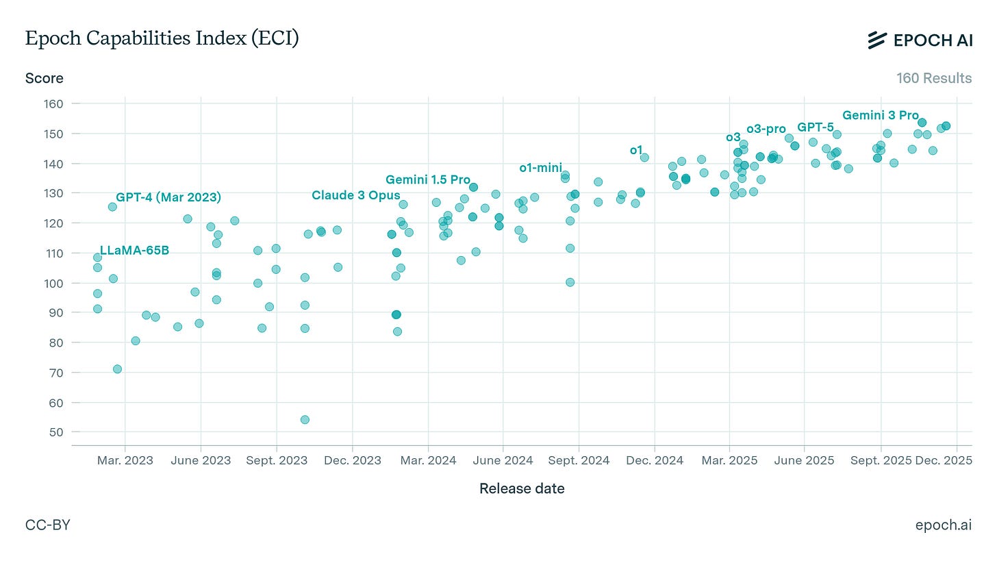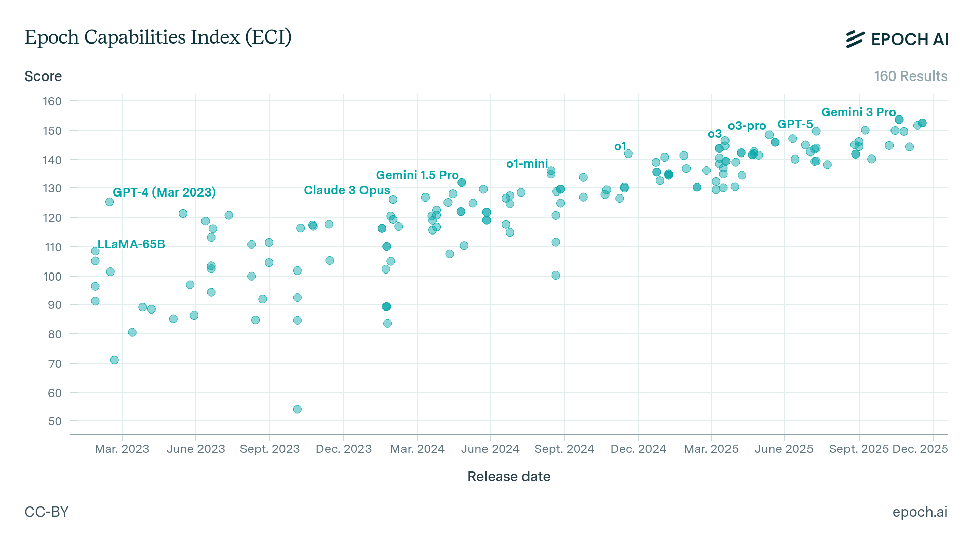 Using item response theory, the same statistics behind IQ tests, Epoch AI published the Epoch Capabilities Index, an “IQ” for AI. The score is based on 1103 benchmarks across 126 AI models (Ho et al., 2025).