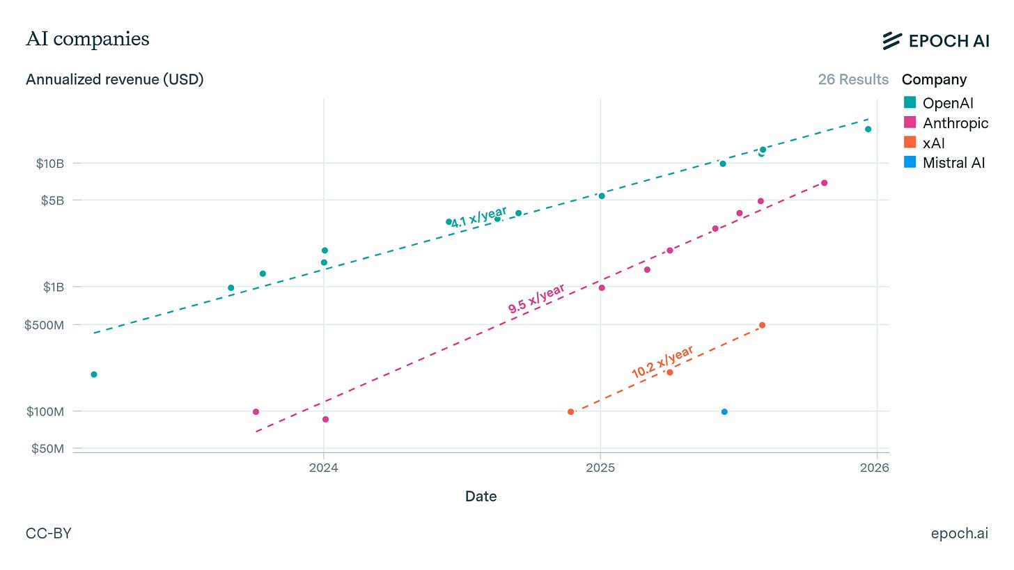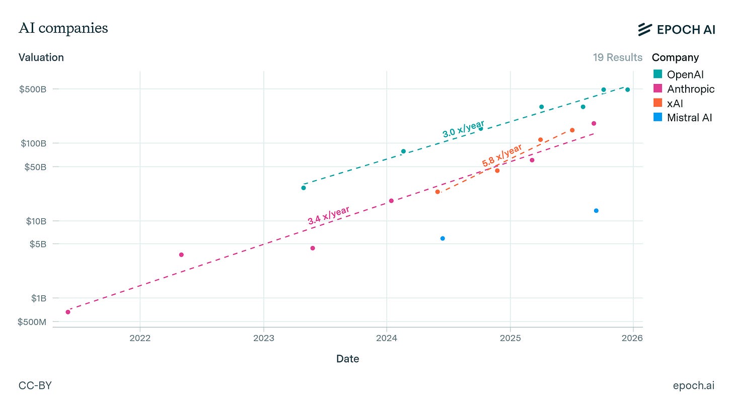 Revenue and valuation for AI companies are growing exponentially. For OpenAI, valuation is increasing at 3.0x per year, with revenue growing faster at 4.1x per year.