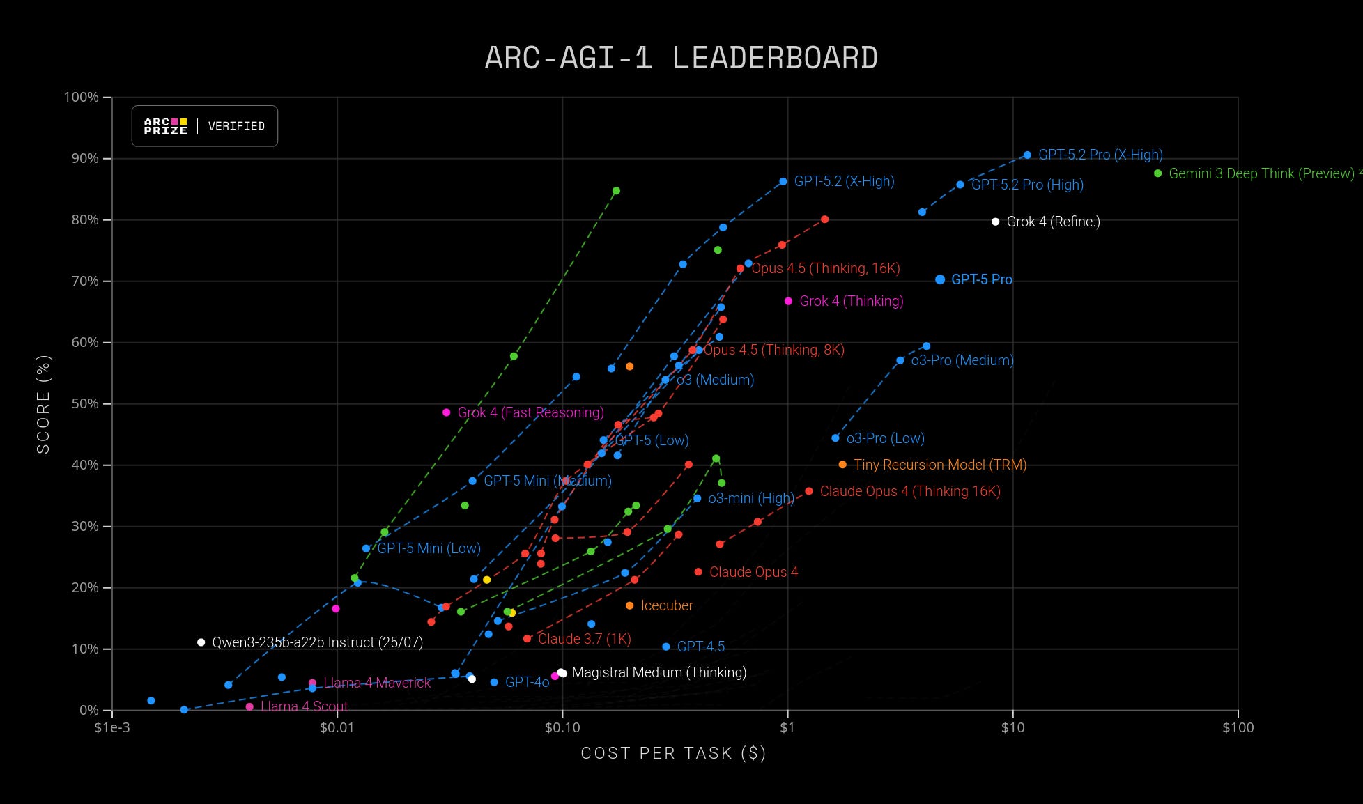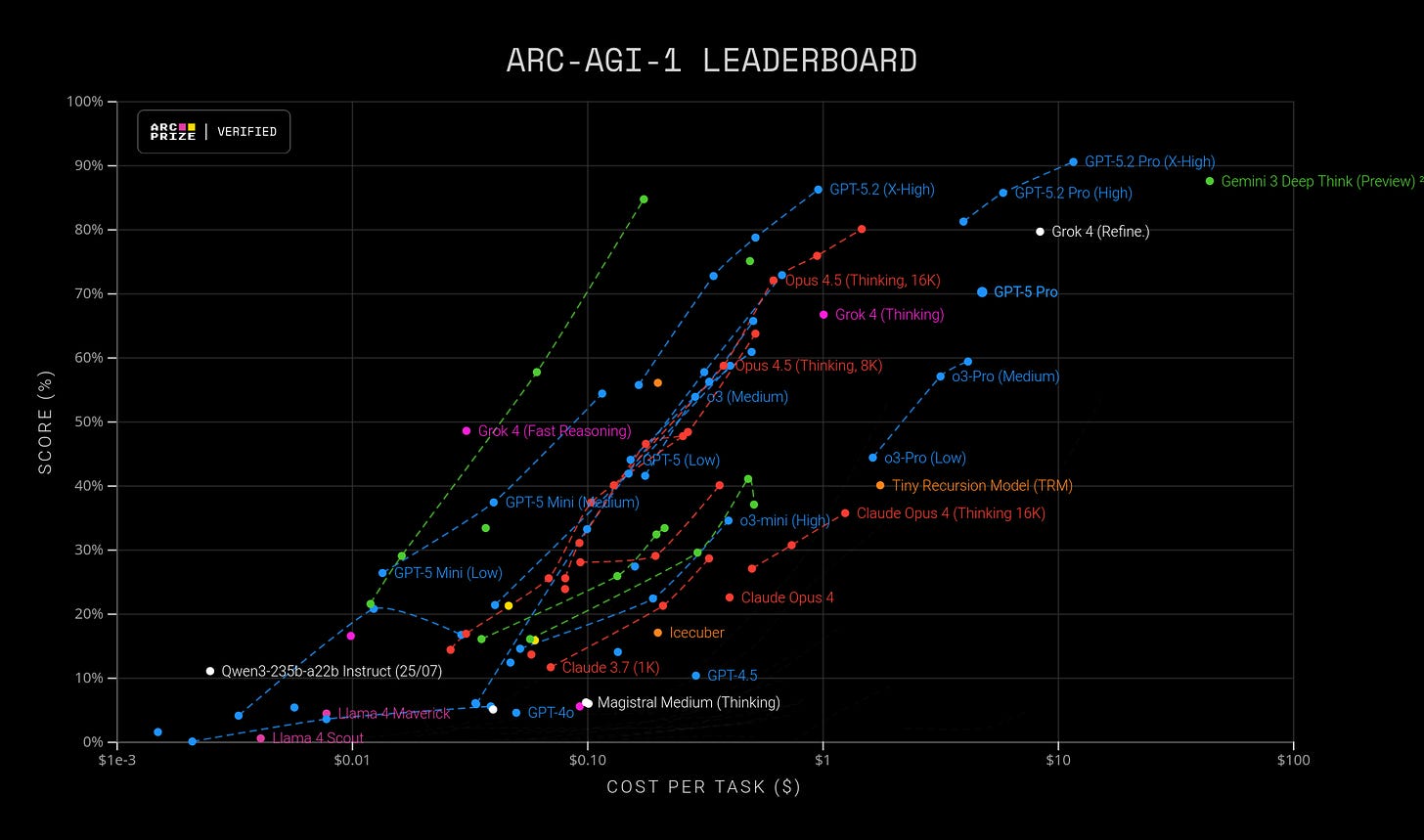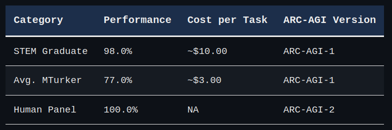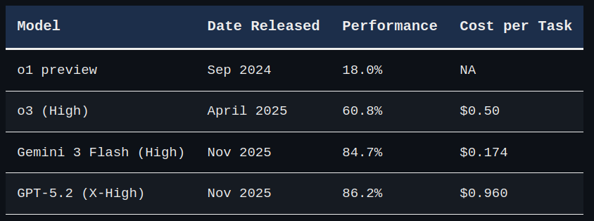 This is no longer true. AI performance has skyrocketed from 18.0% to 86.2% in one year, now matching average human performance at 3x cheaper cost than an MTurker2, or 17x cheaper with Gemini 3 Flash. Benchmark saturation is near for ARC-AGI-1.
