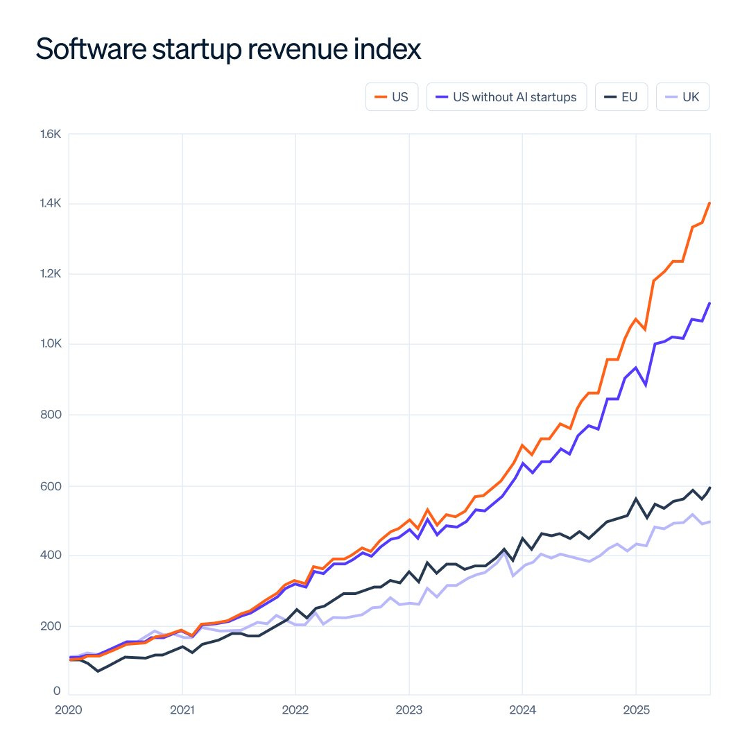 This is confirmed by the decoupling in total startup revenue between AI and non-AI startups.