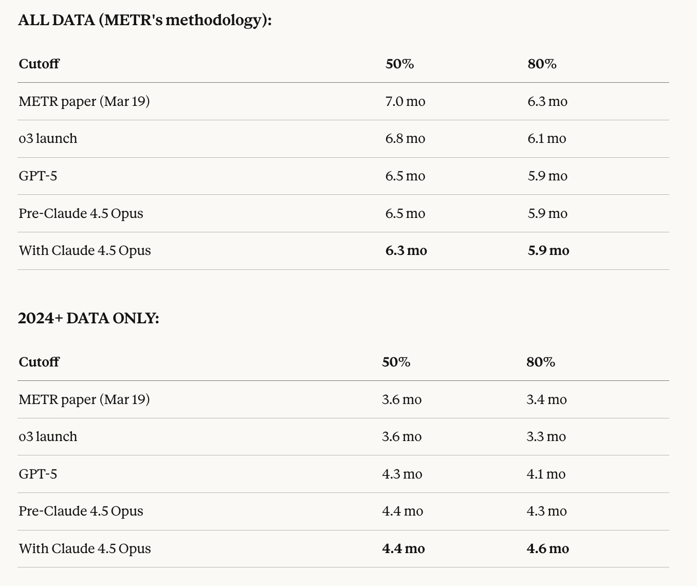 The duration of the longest task AI can autonomously complete (METR) doubles every 4 months.