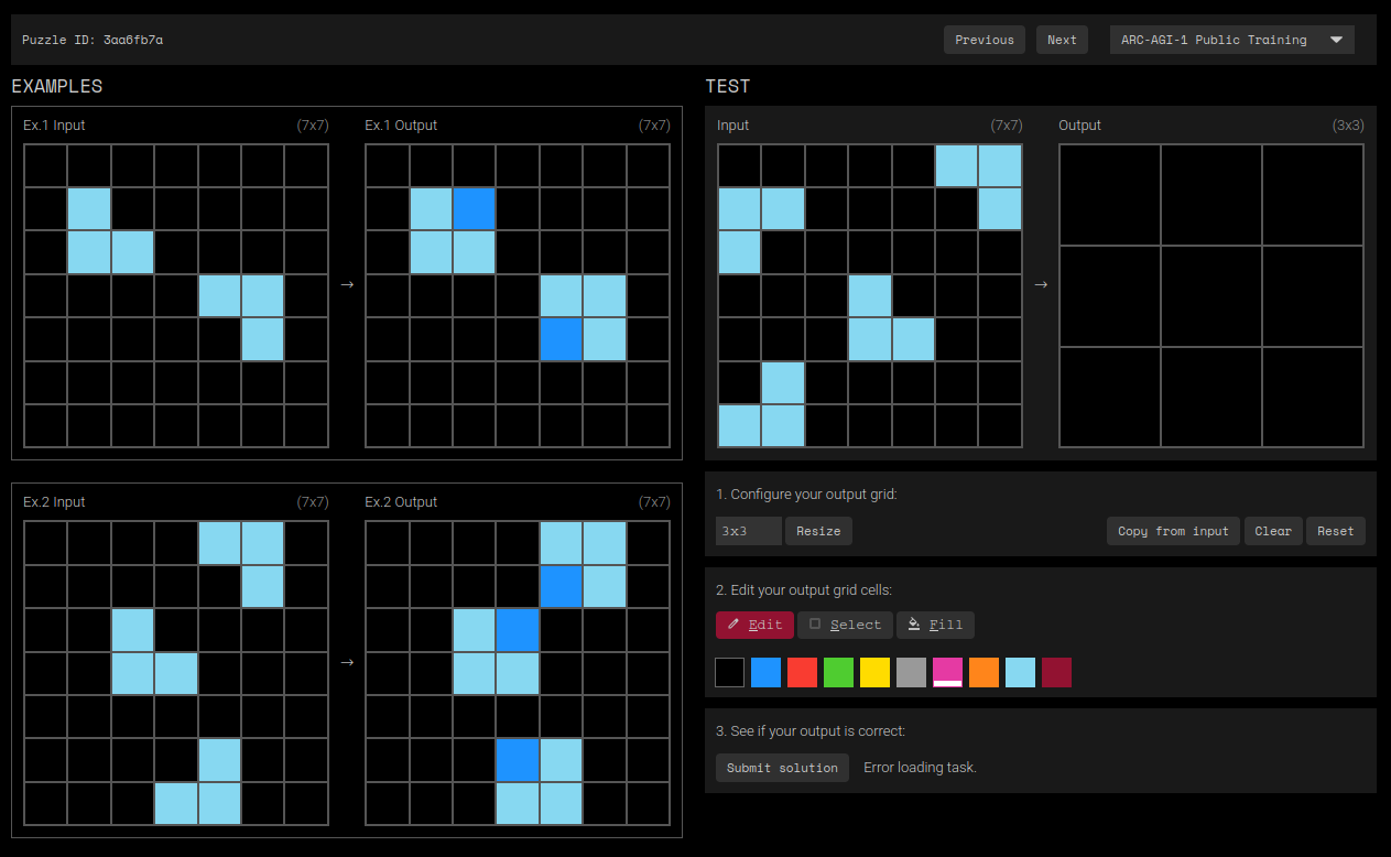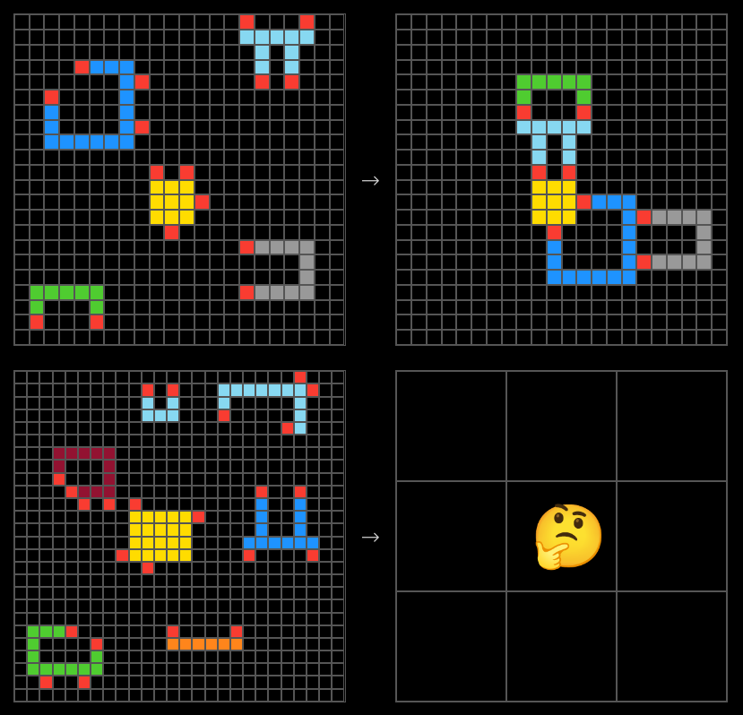 ARC-AGI has two versions: an “easy” benchmark (ARC-AGI-1) and a “hard” benchmark (ARC-AGI-2). Example questions from each:
