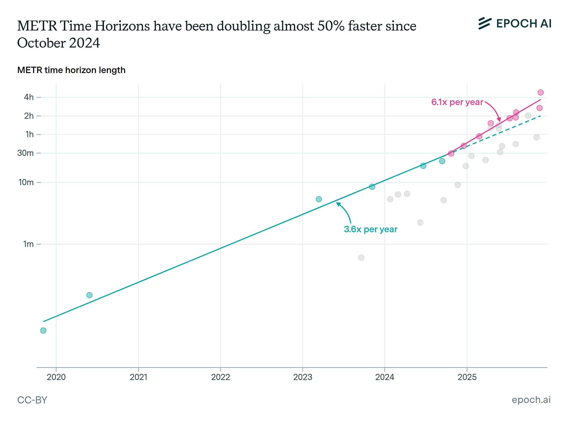 The doubling time across this period is roughly 6 months. A piecewise regression from 2024 onwards shows it has shortened to about 4 months. More on this acceleration later.