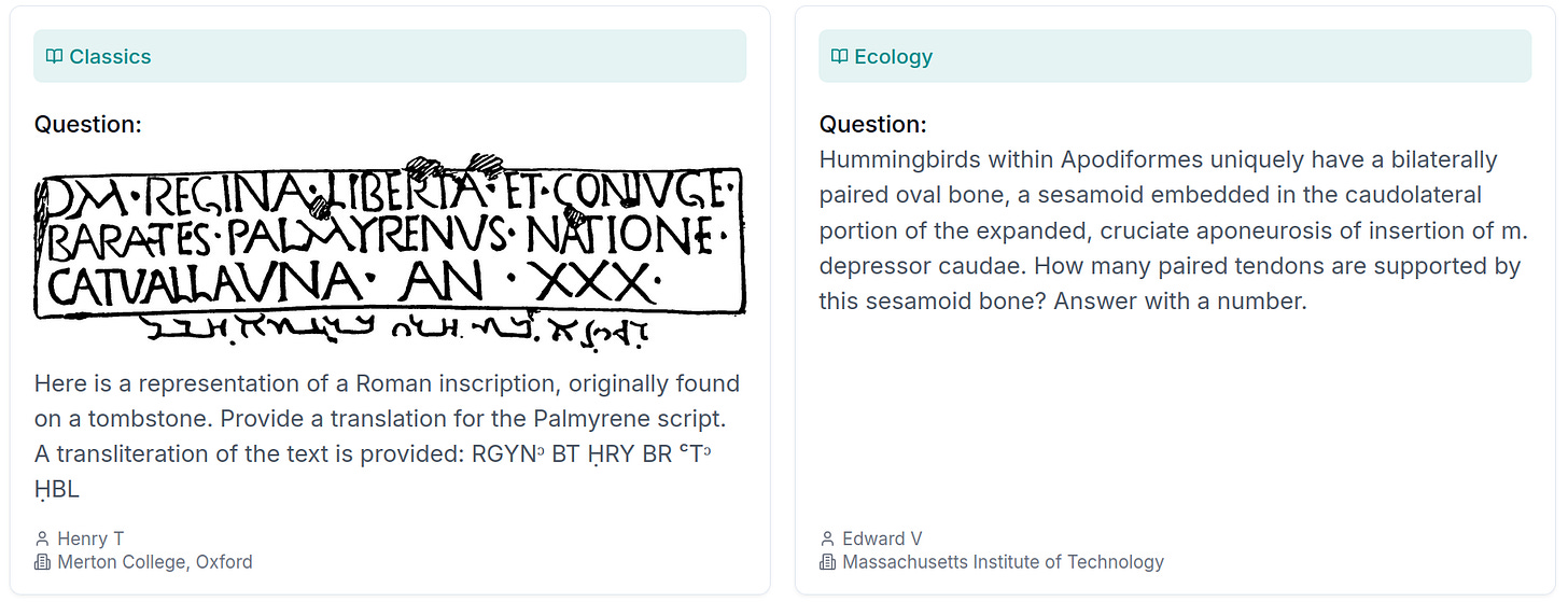 But AIs are not omniscient. Humanity’s Last Exam (Phan et al., 2025) is the most difficult knowledge benchmark. Example questions from their website:
