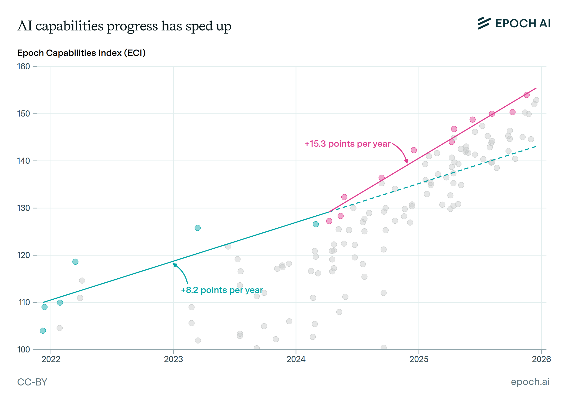 AI capabilities are accelerating. Aggregate benchmark performance shows the rate of progress roughly doubling since 2024.
