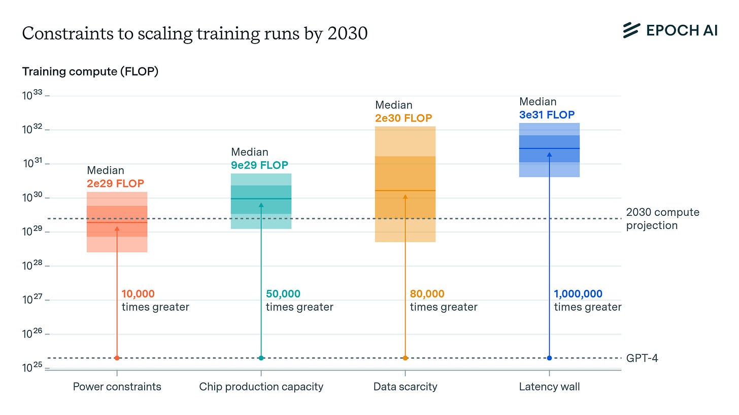 GPUs are power hungry. By the 2030s, AI demand for electricity will exceed the US power grid. Epoch provides estimates for other hard limitations, such as chip production capacity. Note that data scarcity is likely not an issue: since AIs are now trained through reinforcement learning, they self-generate data. The fear that AI would run out of text to predict no longer applies.
