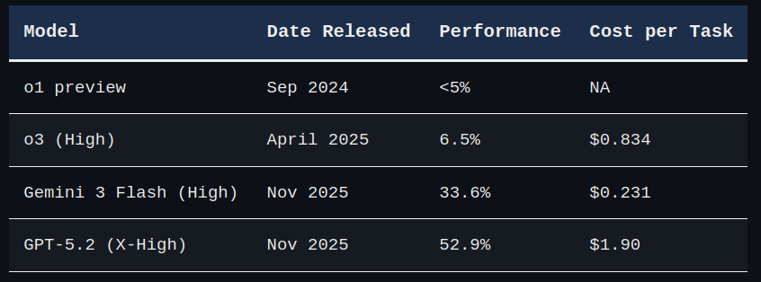 For ARC-AGI-2, AI barely reached 5% last year. Now it’s at 52.9% at a price cheaper than a human.3