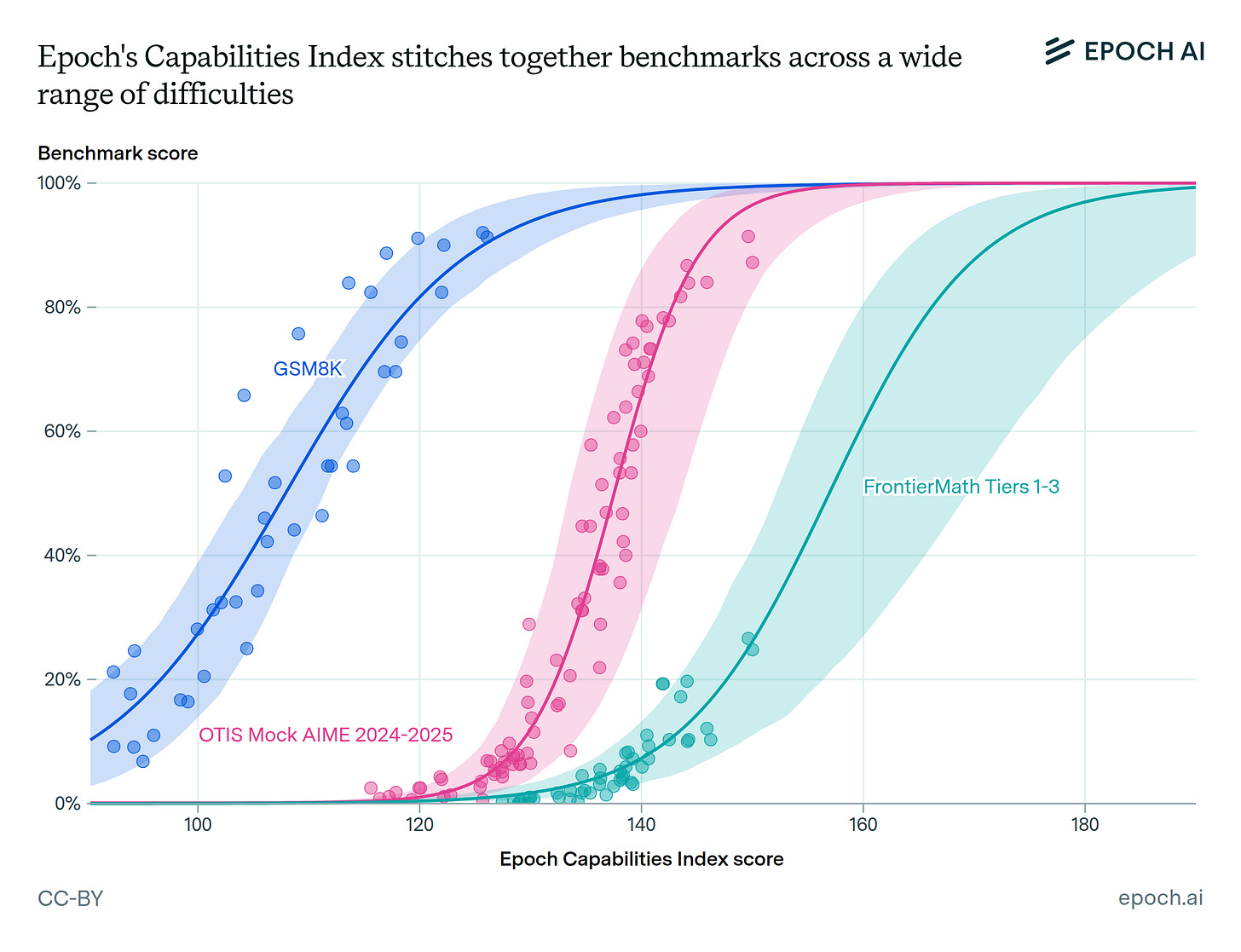 We can test this. ECI performance across three mathematics benchmarks shows that between models, ECI correlates with mathematical outcomes.