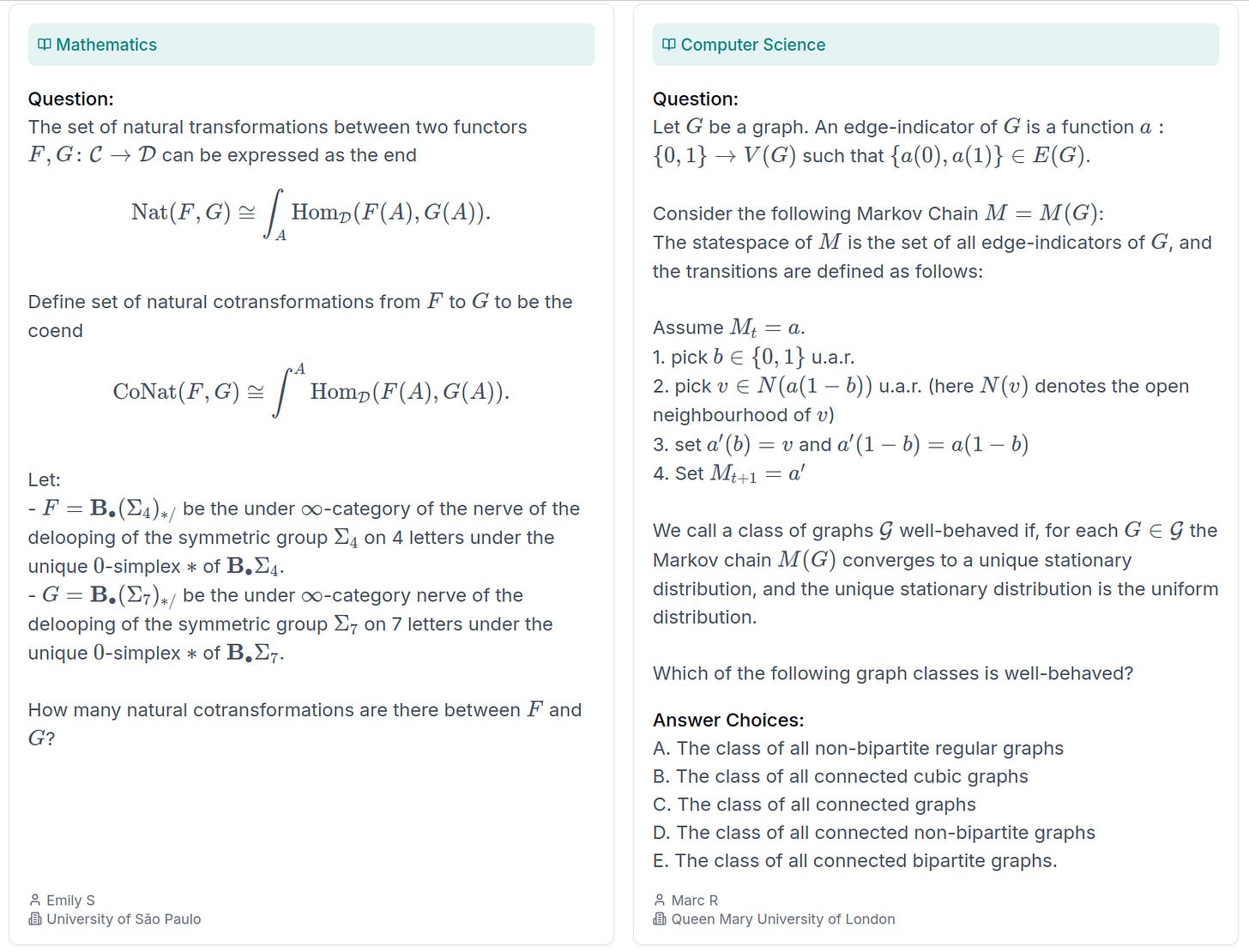 Phan, L., Gatti, A., Han, Z., Li, N., Hu, J., Zhang, H., Zhang, C. B. C., Shaaban, M., Ling, J., Shi, S., Choi, M., Agrawal, A., Chopra, A., Khoja, A., Kim, R., Ren, R., Hausenloy, J., Zhang, O., Mazeika, M., … Hendrycks, D. (2025). Humanity’s Last Exam (No. arXiv:2501.14249). arXiv. https://doi.org/10.48550/arXiv.2501.14249