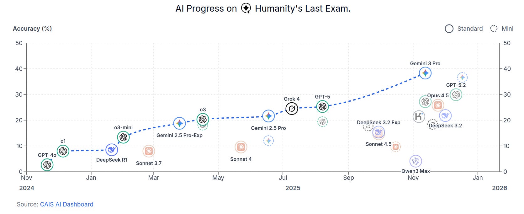 Consistent with other benchmarks, AI has moved from <5% to ~40% correct in one year. By end of 2026, this benchmark will likely be saturated.