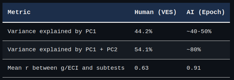 The first principal component explains similar variance in both human cognitive tests (44%) and AI benchmarks (40-50%). This parallel is meaningful: AI capabilities emerged with a human-like factor structure without being explicitly designed that way.