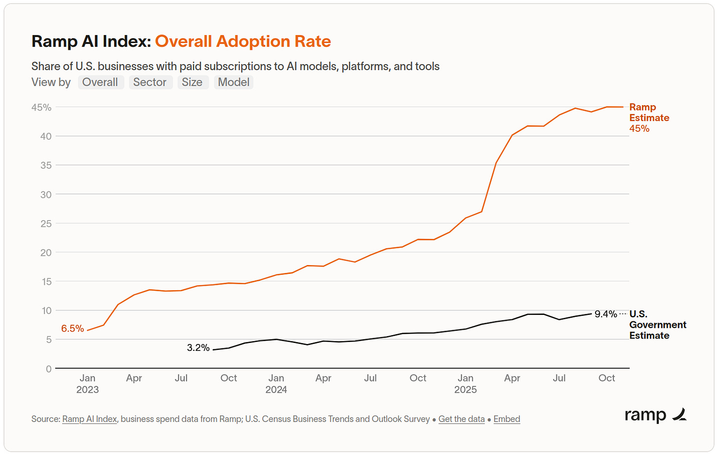 Adoption extends beyond casual users to enterprise. The proportion of US businesses with paid AI subscriptions is consistently increasing: from ~26% to ~45% since the start of 2025.