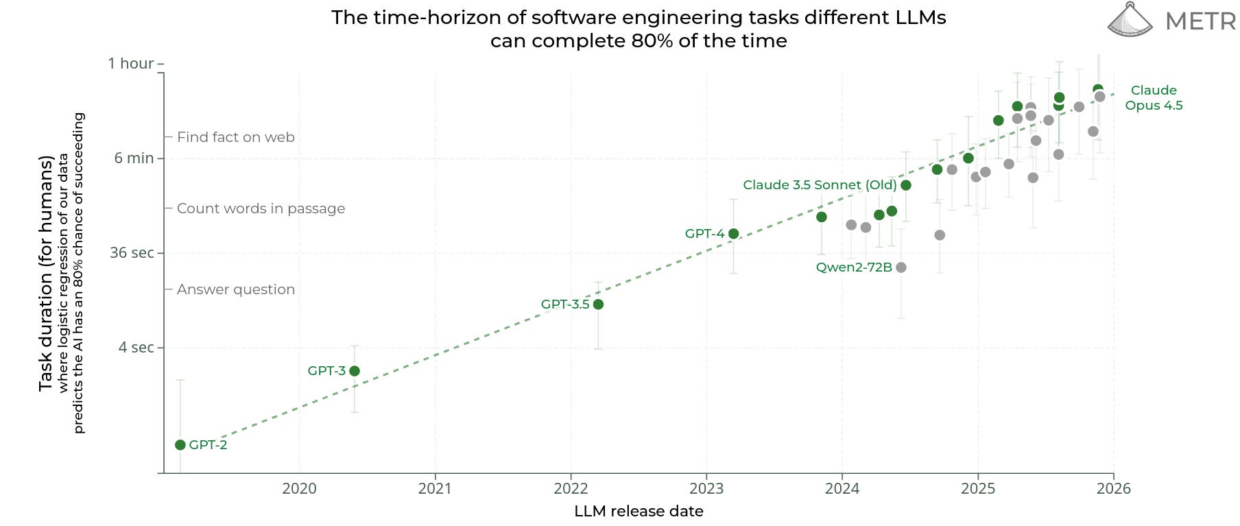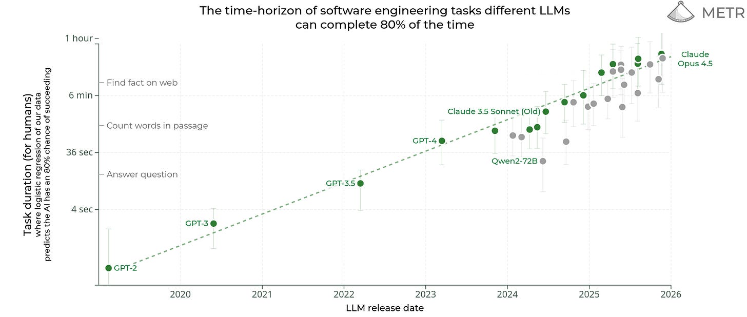 As a user since GPT-4 and an early adopter of agentic interfaces like Cursor and Claude Code, I’ve seen the time horizons expand firsthand. It could barely write a single function a few years ago, and it would be very slow at doing so. Then it could write sections of scripts and some middling logic. Then the entire script, and quickly too. Now it can interact with entire codebases, writing and executing scripts on my machine directly rather than through a browser.